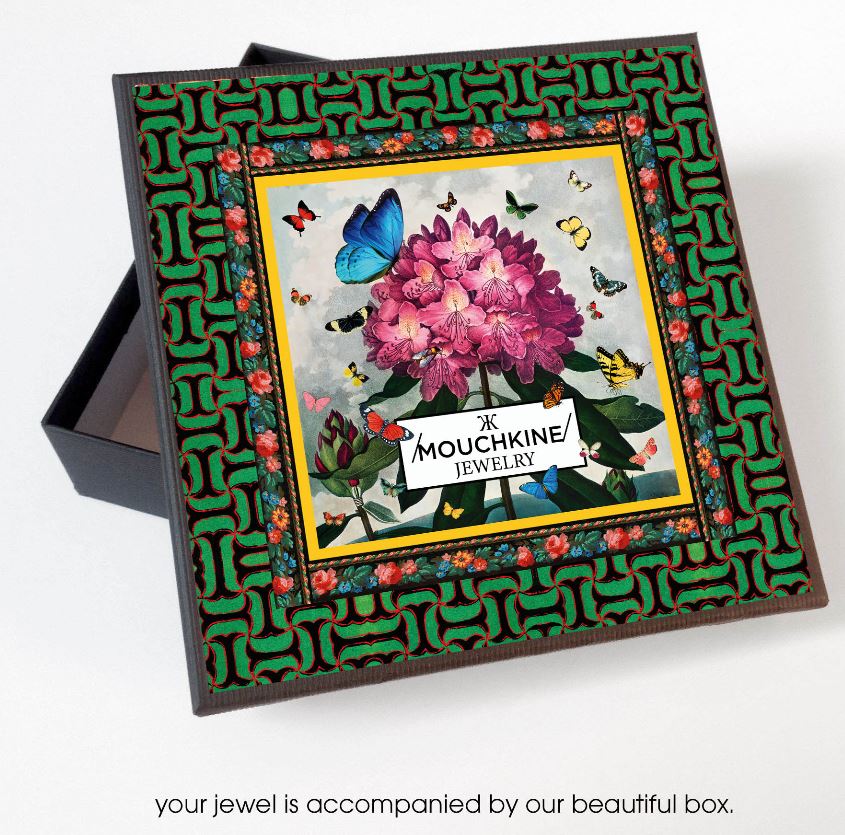 Les bijoux Mouchkine Jewelry sont tous tait main en France par nos soins en quantité ultra limitée, composés de feutrine, fleurs en céramique, résine, cristal de Swarovski...