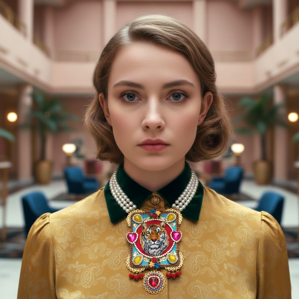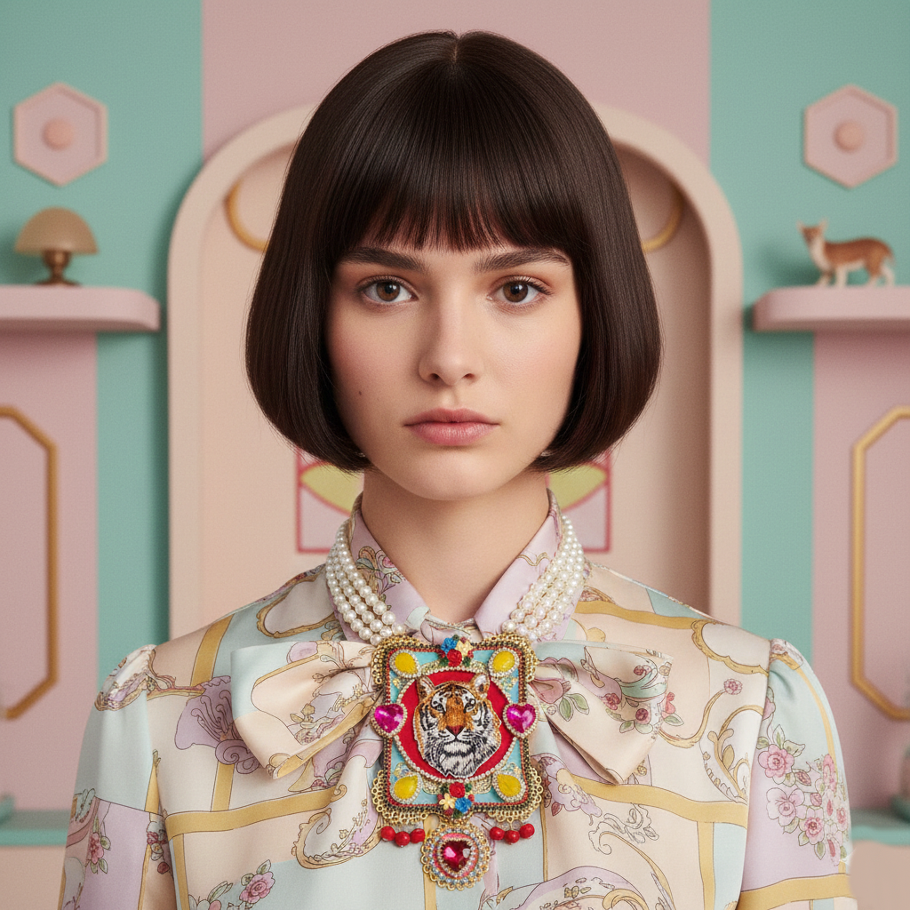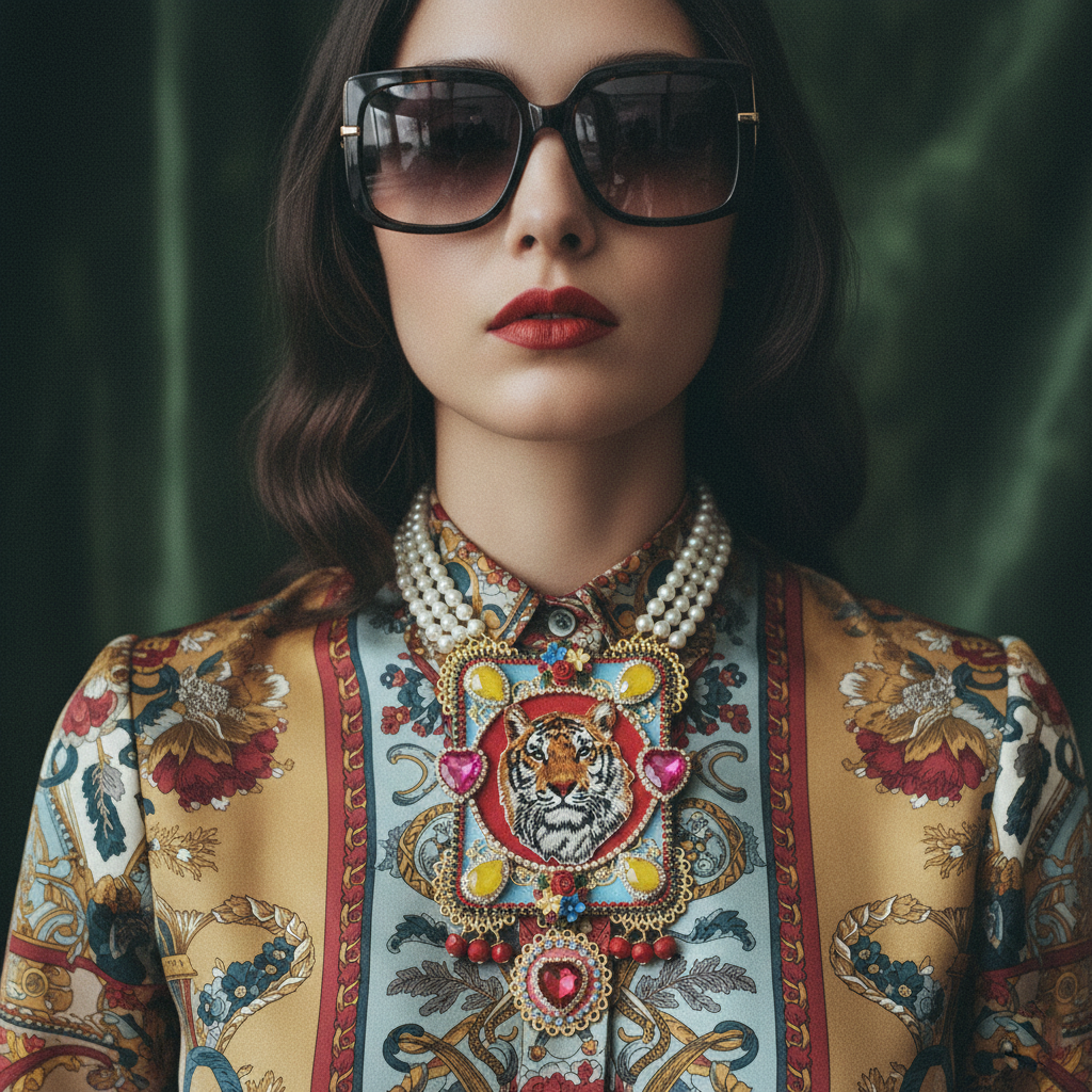 Mouchkine Jewelry Tiger Necklace. Entirely handmade & made in France, a haute couture jewel to sublimate your style with grace & elegance. A magnificent masterpiece ornate with a subime embroided tiger, pink glass hearts, yellow chipped citrine stones, and delicate red glass pearls.