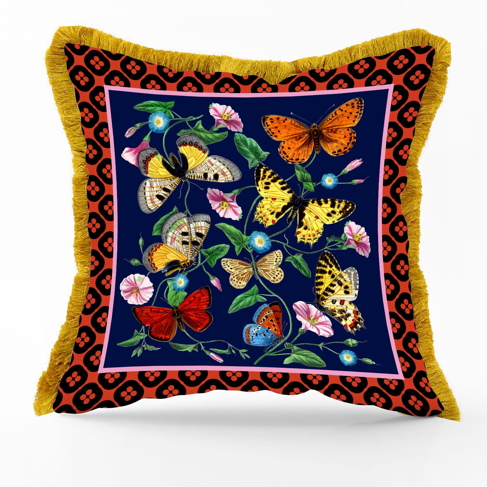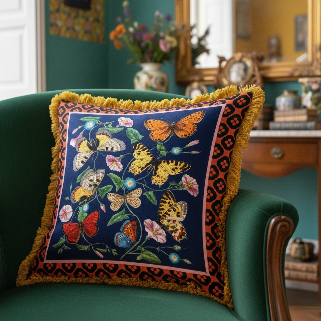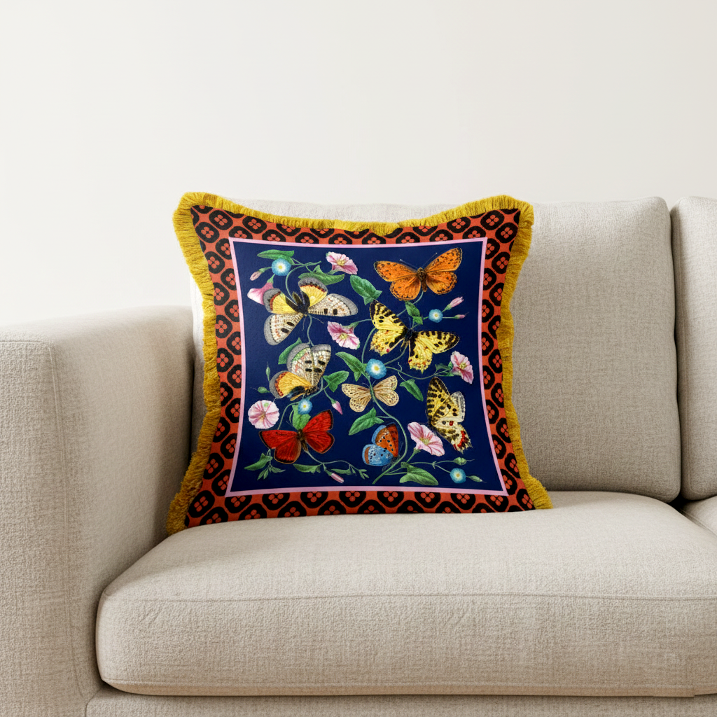 housse de coussin papillons 50x50cm LUXE passepoil brosse or